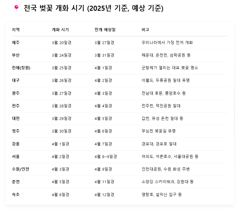 2025년 전국 주요 벚꽃 축제 일정을 지역별로도 정리해드릴게요. 벚꽃은 보통 개화 후 일주일 정도 지나면 만개하므로, 축제 기간 중간쯤 방문하시면 가장 아름다운 벚꽃을 감상하실 수 있습니다.